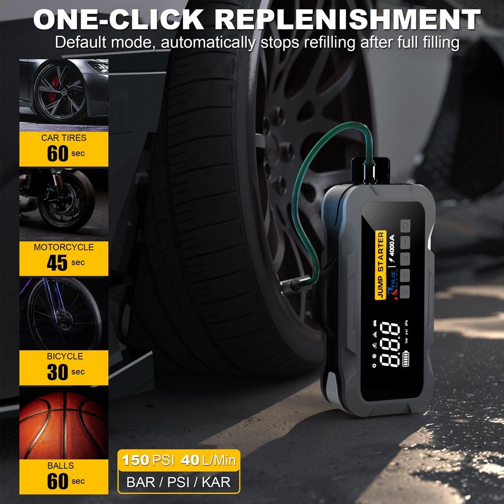⚙️ المواصفات الرئيسية :🔋 سعة البطارية: 24000mAh — استخدام طويل الأمد دون انقطاع⚡ تيار البدء: 4000A — لتشغيل حتى أقوى أنواع السيارات بسهولة🔌 منافذ الشحن :مدخل Type-C (5V/3A, 18W) للشحن السريع3 مخارج USB (5V/3A, 9V/2A, 12V/1.5A) لشحن الهواتف، الأجهزة اللوحية، واللابتوبات💨 ضاغط هواء مدمج مع 4 أوضاع لنفخ الإطارات، المراتب، الكرات وغيرها🔦 كشاف LED قوي مع أوضاع متعددة: ضوء عادي / وامض / تحذيري🔋 Power Bank لشحن جميع أجهزتك أثناء التنقل📏 الأبعاد: 210 × 106 × 50 مم — تصميم مدمج وسهل الحمل🌡️ نطاق التشغيل: من -20°C إلى +60°C — مقاوم للظروف الصعبة🌟 المميزات :