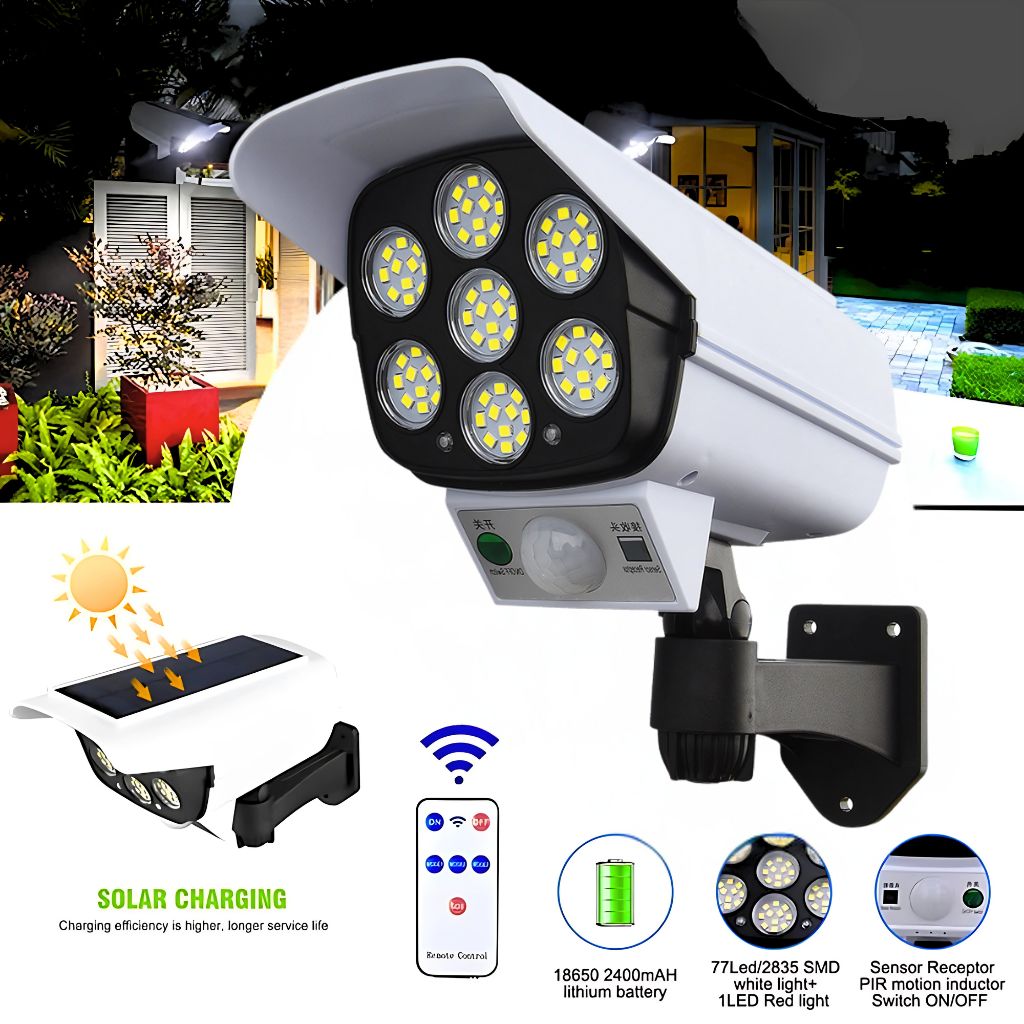 Il fournit un éclairage ultra-lumineux la nuit, en plus, il est équipé d’un détecteur de mouvement.Il ressemble à un véritable appareil photo, agit comme un excellent moyen de dissuasion et protège vos biens.Il se recharge automatiquement à l’énergie solaire pendant la journée pour l’éclairage nocturne.Imperméable, résistant à la chaleur et adapté à tous les temps.Très facile à installer, il s’installe en moins d’une minute.Contient 77 LED pour un éclairage super brillant.Batterie longue durée.Équipé de trois modes d’éclairage.Télécommande.