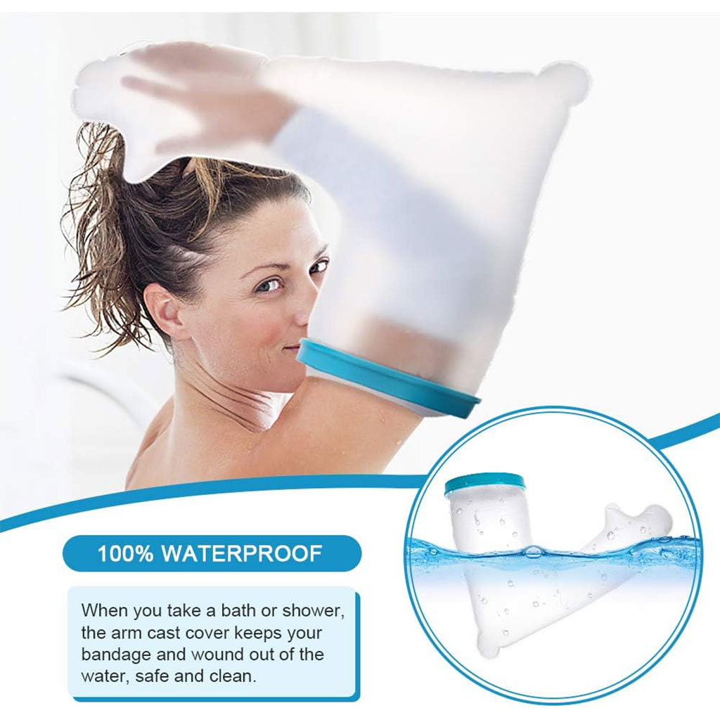 بطول 60 سم، يغطي الذراع بالكامل، مما يجعله مثاليًا لحماية الأصابع والذراع. مصنوع من مادة خفيفة، صحية وقابلة للغسل، لا تلتصق بالذراع. الفتحة المركزية المرنة، التي يمكن أن تمتد حتى 15 سم قطرًا، واسعة بما يكفي لمرور الجبيرة، وفي الوقت نفسه محكمة بما يكفي لمنع تسرب الماء.